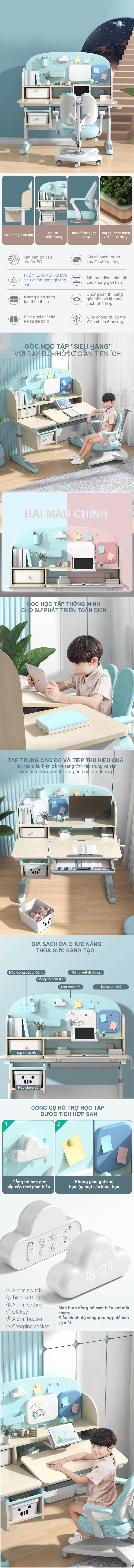 Bộ bàn học được thiết kế nhằm tạo ra một không gian học tập với đầy đủ tiện ích như bảng viết, bảng ghi chú, đồng hồ cảm ứng thiết lập thời gian học tập.